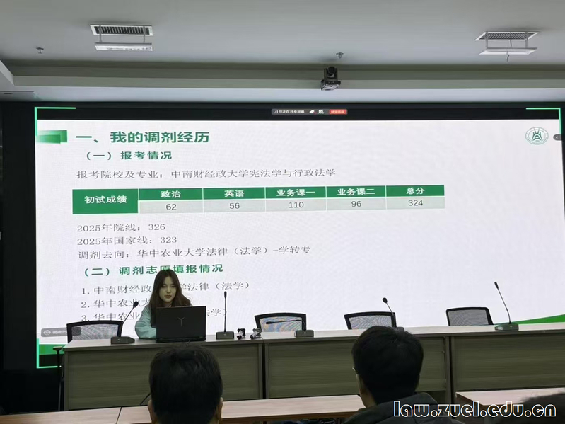 会议伊始,法学院党委副书记李司铎作调剂动员讲话。 她强调在调剂过程中应“坚定目标,摆脱执念”,并深入剖析了当前调剂的整体形势,提醒同学们要更加精准、更加充分、更加提前做好信息收集和复试准备工作,做好关键抉择。