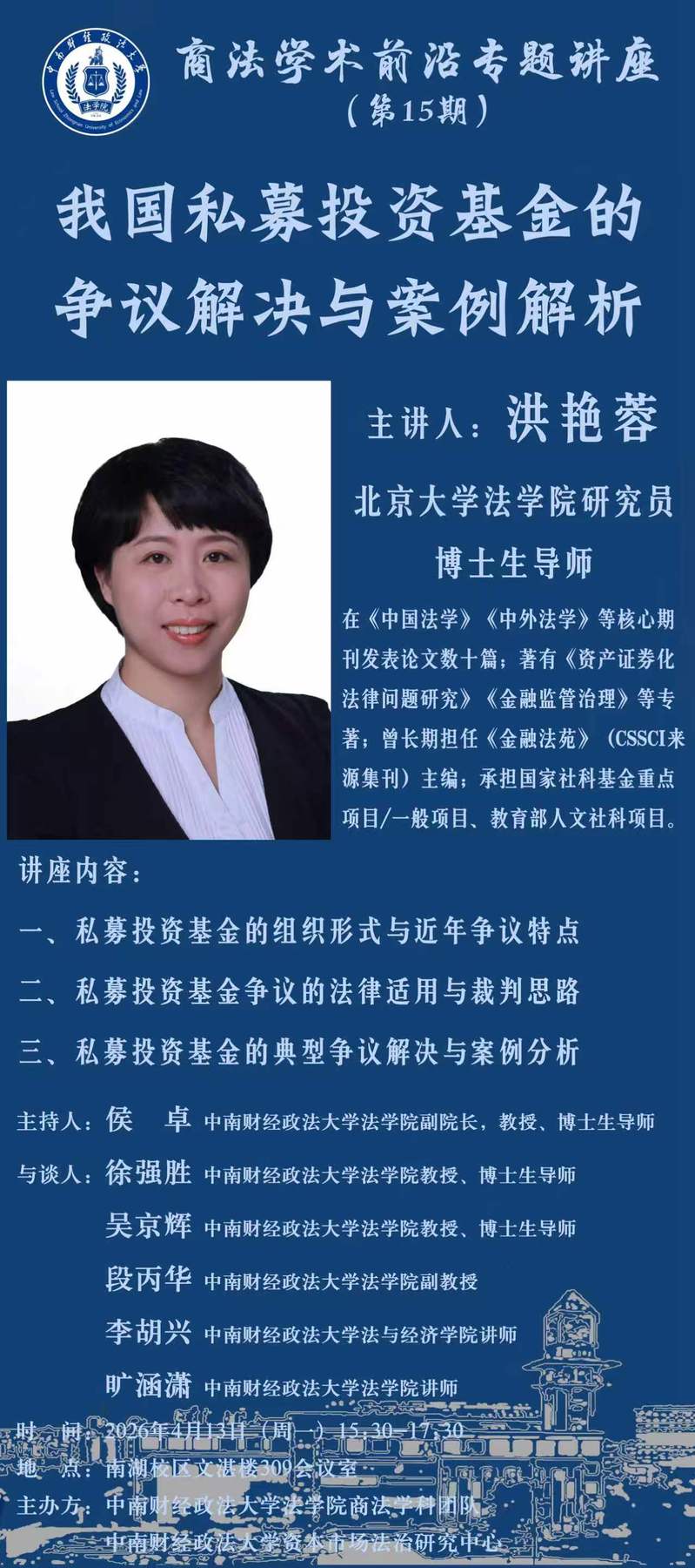 预告丨商法学术前沿专题讲座(第15期)洪艳蓉:我国私募投资基金的争议解决与案例解析