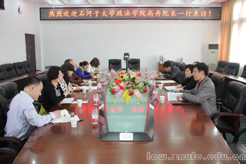 3月31日,新疆石河子大学政法学院执行院长高卉携该校各学科带头人来访我院。我校法学院副院长黎江虹教授、副院长张红教授、法硕教育中心副主任郭雷生副教授参加座谈。双方在文泓楼四楼会议室就相关事宜进行讨论。