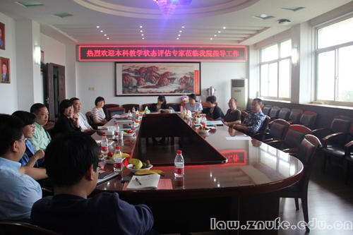 5月13日上午8点30分,中南财经政法大学本科教学工作状态评估专家组张新国教授、何捷一教授、高利红教授以及工作组的刘建秋主任、潘明慧科长一行到法学院对我院本科教学工作进行审核评估。法学院院长徐涤宇教授、院党委肖崇明书记、副院长黎江虹教授、副院长简基松教授、副院长胡弘弘教授、院党委袁桂君副书记以及院本科教学状态评估工作小组成员参与了此次会议。