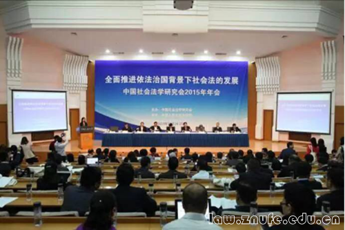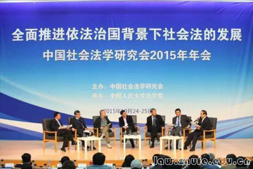 10月24日至25日, 中国社会法学研究会2015年年会在中国人民大学逸夫会议中心成功举办。本届年会由中国社会法学研究会主办,中国人民大学法学院承办,来自社会法学理论与实务界的200余位嘉宾参加了本次会议。会议主题为“全面推进依法治国背景下社会法的发展”,会议围绕“社会法与法治社会建设”、“健全劳动关系协调机制”、“劳动权利的体系和内容”、“社会保障法的顶层设计与制度完善”、“民法法典化下劳动法的机遇与挑战”等重要议题展开。我校法学院韩桂君副教授与经济法专业硕士生黄晓华同学应邀参加了此次会议。