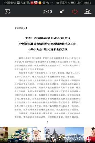 通讯员(孙艺)2020年3月5日上午,法学院教工行政一支部开展了一次“别样”的主题党日学习活动,即通过在线会议方式组织分散在全国各地的19名党支部成员集中深入学习习近平总书记关于疫情防控重要讲话和指示批示精神。