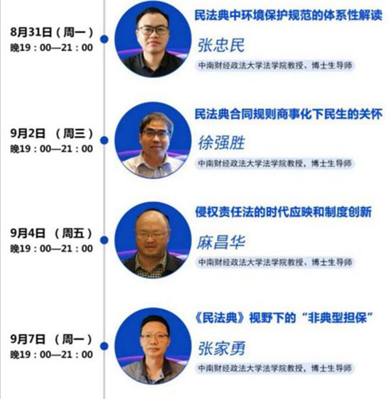 以上讲座均可登录中国知网在线教学服务平台回放观看。此外,821日至916日每周一、周三、周五讲座将于线上持续进行,我院张忠民教授将于831日讲授《民法典中环境保护规范的体系性解读》,徐强胜教授将于92日讲授《民法典合同规则商事化下民生的关怀》,麻昌华教授将于94日讲授《侵权责任法的时代应映与制度创新》,张家勇教授将于97日讲授《民法典视野下的“非典型性担保”》,敬请关注!