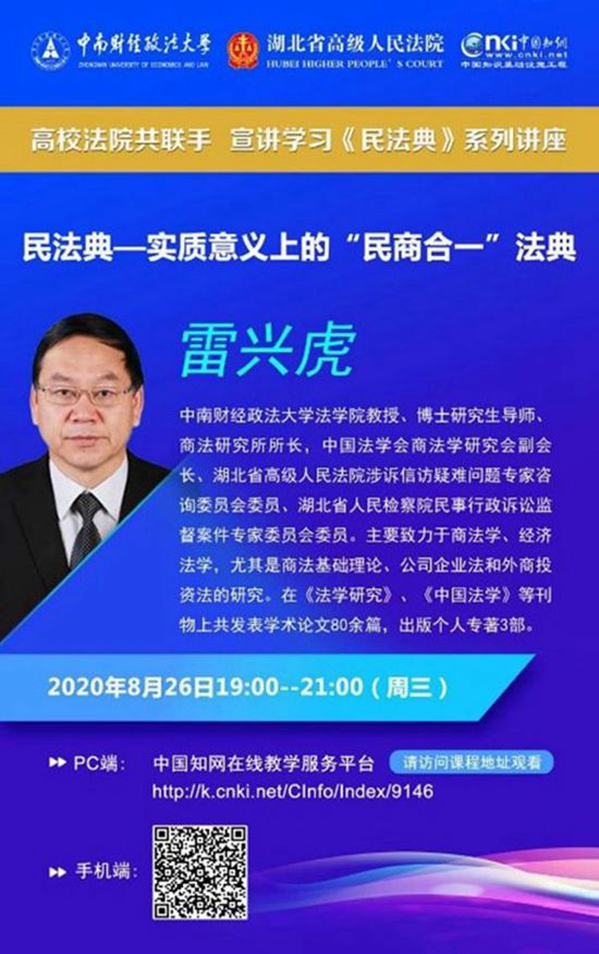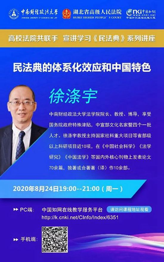 通讯员(梁芷涵)824日至28日晚,我校与湖北省高级人民法院携手举办的学习《民法典》系列讲座,由法学院院长徐涤宇教授、雷兴虎教授、温世扬教授于中国知网在线教学平台率先开启授课。