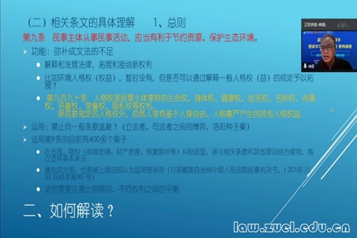 张忠民教授以“因何解读、如何解读、解读为何”三问入手,详细阐释民法典的价值与意义、民法与环境法的关系、篇章结构及体系分布、相关条文的具体理解,他指出在民法典中确立环境保护规范的过程中,受环境侵权等基础范畴认知不一、同一案件主体感受不同等主客观因素的限制,沟通协调任重道远,因此对其进行体系性解读有利于环境司法守正出新。此外,张忠民教授在讲座最后还提出四点倡议:一是社会各界树立环境保护“人人有责、多元共治”意识,二是重视法律部门协调发展、保持学科特质与本色,三是自信、动态地看待法律的发展和学科的变革,四是寻求权利与权力间的最佳平衡点。
