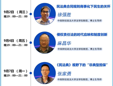 本次讲座可登录中国知网在线教学服务平台观看回放。稍后,我院徐强胜教授将于9月2日晚7点(今晚)线上讲授《民法典合同规则商事化下民生的关怀》,麻昌华教授将于9月4日讲授《侵权责任法的时代应映和制度创新》,张家勇教授将于9月7日讲授《民法典视野下的“非典型担保”》,敬请关注!