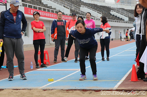 脚踏飞燕轻盈跃,汗撒黄沙笑颜开。黄沙飞扬间,资琳老师一跃而起,平稳落入沙坑,以2.03米的优异成绩斩获教工女子立定跳远第三名。