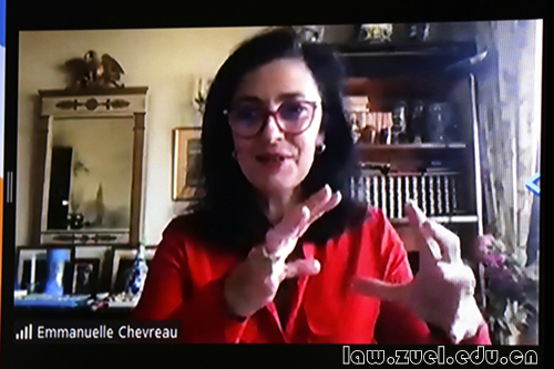 通讯员(邓瑜婕 蒋琼 梁瑜洁)11月27日晚,法典编纂史系列学术讲座第四期——《<拿破仑民法典>与罗马法传统》——在文澴楼八楼809学术会议厅按时举行。本期讲座采取线上线下结合的方式,法国巴黎第二大学教授、国家法律委员会主席、巴黎万神殿法律史教授、法律史实验室成员Emmanuelle Chevreau通过视频连线担任主讲人,中南财经政法大学罗马法系研究中心主任黄美玲教授担任主持人。众多法科学子到场聆听,许多国内外学者与青年才俊线上参会,共同交流学习。