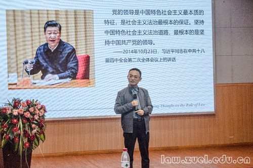 开幕式结束后,徐亚文教授和刘磊老师分别从不同角度,作了关于习近平法治思想的专题讲座。徐亚文教授以《习近平法治思想中关于坚持建设中国特色社会主义法治体系的重要论述》为题,系统讲解了“坚持建设中国特色社会主义法治体系”提出的背景、重要地位及核心要义。刘磊老师以《习近平法治思想中党对法治工作的全面领导 》为题,从习近平法治思想中党领导法治工作的基本原理、党对法治工作全面领导的主要内容、全面从严治党与加强党对法治工作的领导三个方面作出详细阐释。