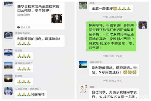得知这一不幸消息,最高人民检察院检察长张军委托河南省检察院党组书记、检察长段文龙专程前往西华县,看望慰问朱金超家属,并转达张军的深切慰问。河南校友会在中秋节期间专程慰问了朱金超校友的家属,对朱金超校友的突然离世表示沉痛的哀悼和悲痛、痛惜、不舍之情。