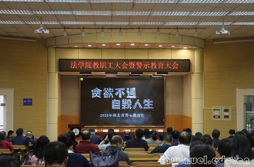 (通讯员 吕瑞)为加强党风廉政建设和师德师风教育,调动全院教职工参与学科建设的积极性,10月14日下午,法学院在文潭楼一楼报告厅召开教职工大会暨警示教育大会,集中观看2021年湖北省警示教育片,部署学科建设工作,开展师德师风和警示教育活动。法学院党委书记张学平主持大会。