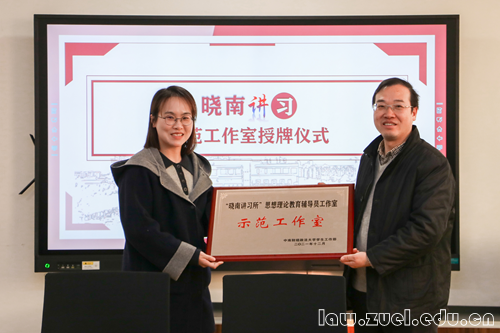 通讯员(金子欣 邹欣宜 杨晨宇)12月21日下午,为全面贯彻落实习近平新时代中国特色社会主义思想,进一步加强我校辅导员工作室建设,“晓南讲习”示范工作室授牌仪式在文治楼515室顺利举行。我校党委学生工作部余小朋部长,葛明副部长,刘祚衡老师,法学院党委张学平书记,刘筱彤副书记以及法学院辅导员出席会议。