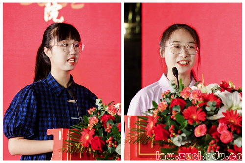 在校生代表、2020级本科生刘子嘉和新生代表、2022级硕士研究生田腕君依次上台发言。刘子嘉在发言中分享了在参加“杰赛普国际模拟法庭辩论赛”时关于“选择”与“坚持”的认知,并动情地说到:“每一次的历练都有自己的领悟和收获,大学是一场‘厚积薄发’的历练”。田腕君结合自己自强不息的奋斗经历,向同学们分享了她关于成为一个“基础扎实,思维严谨”、“以责立身,兼济天下”、“饮水思源,懂得回报”的法律人的理解与思考。