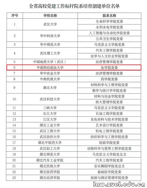通讯员(吕瑞)近日,中共湖北省委教育工委公布了全省高校党建工作标杆院系、样板支部培育创建单位名单,本次确定的全省高校党建工作标杆院系培育创建单位共60个,中南财经政法大学法学院党委入选。这是自法学院法律硕士教育中心学生党总支顺利通过第二批“全国党建工作样板支部”验收以来,法学院党委深入开展“对标争先”建设计划的重要阶段性成果。