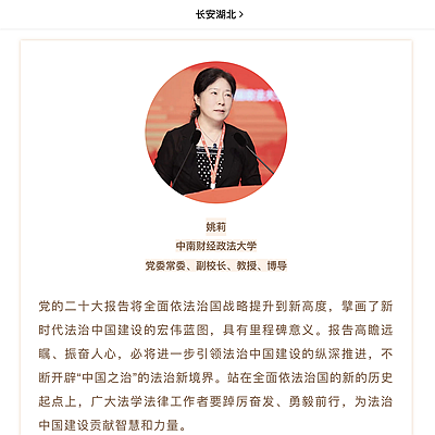 中国共产党第二十次全国代表大会10月16日在北京开幕,中共二十大报告引发社会各界热切关注和持续热议。近日,我校党委常委、副校长,法学院教授姚莉接受《中国新闻网》《长安湖北》等媒体采访,就中共二十大报告中提出的“坚持全面依法治国,推动法治中国建设”等内容进行深度分析和解读,引起强烈反响。