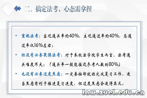 王以玮师姐则着重分享速成法考以及平衡法考与保研的心得。在客观题方面,师姐从总体时间规划、老师选择、答题的注意事项给出了针对性的建议;在主观题方面,师姐则强调要养成刷题和定位法条的习惯,并告诉大家不必过于焦虑。