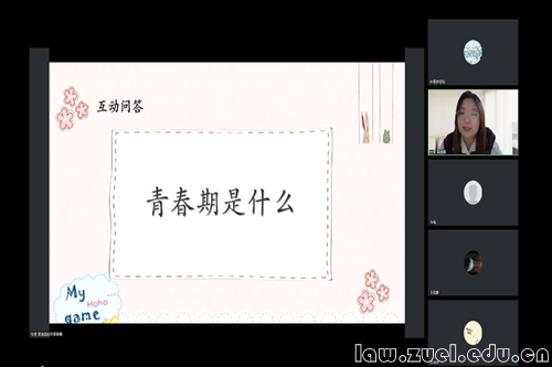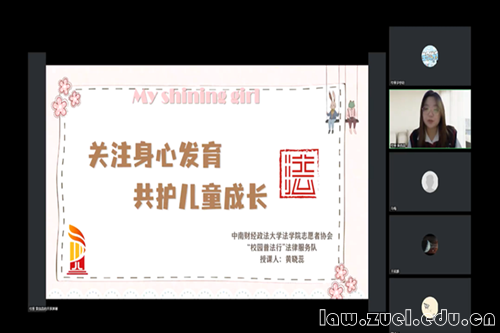 法学院志愿者协会“校园普法行”法律服务队于18日晚上,以腾讯会议直播形式举办 “关注身心发育,共护儿童成长”公益讲座。本次讲座为“同心助童心”志愿服务项目拉开序幕。讲座由法学院志愿者协会志愿者黄晓蕊同学担任主讲人,总计47名宁夏同心县的留守女童在线观看。
