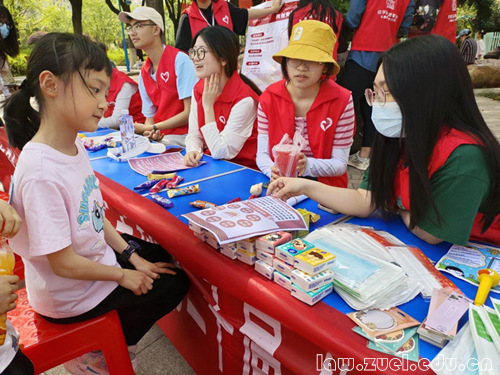 志愿者们在公园内分发本次活动宣传单,通过生动有趣的知识问答调动群众参与积极性;对于部分缺少法律意识的参与者,他们耐心进行引导,寓教于乐,及时科普相关法律知识。参与者特别是青少年群体反响强烈,与志愿者们积极交流、互相配合。