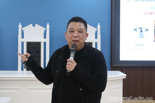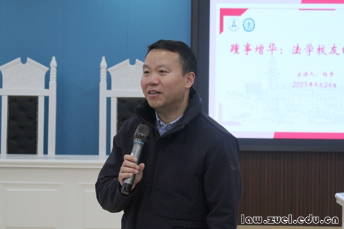 通讯员(瞿玉杰 王雅洁 周语涵)4月24日下午,“踵事增华:法学校友的脚下与远方”专题实务讲座在文泰楼模拟法庭(二)顺利举行。本次讲座以“法学生踏入社会的成长之路——企业法务成长篇”为主题,特邀中南财经政法大学法学院1999级优秀校友,中源企业助理总裁、法务总监杨争先生主讲。讲座由法学院副院长肖志远主持,校友工作与社会合作部笪宁部长、万莉副部长、郭青川老师,法学院团委瞿玉杰老师出席,80余名研究生、本科生到场学习。