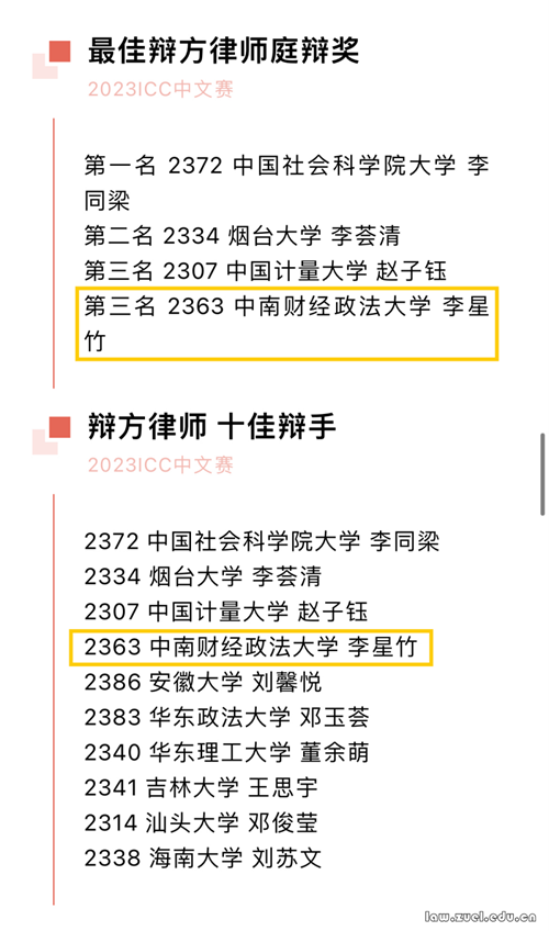 通讯员(梁卓 黄馨如)2023417日,2023年国际刑事法院中文模拟法庭竞赛圆满落幕。本次比赛共有来自清华大学上海交通大学南京大学山东大学吉林大学中国社会科学院大学华东政法大学在内的85支高校代表队注册参加,共有45支代表队参与了正赛环节。经过激烈的角逐,我校代表队荣获本届竞赛团体三等奖队员李星竹获最佳辩方律师庭辩奖“辩方律师十佳辩手”。我校代表队由法学院国际法系梁卓讲师担任教练,2021级国际法专业研究生谷放担任助理教练,2021级本科生李星竹乔哲钰杨柳2022级研究生黄馨如卢洁仪为参赛队员。代表队在组建备赛和比赛过程中得到了法学院江河副院长的关心和指导以及英文赛教练胡梦达讲师的帮助