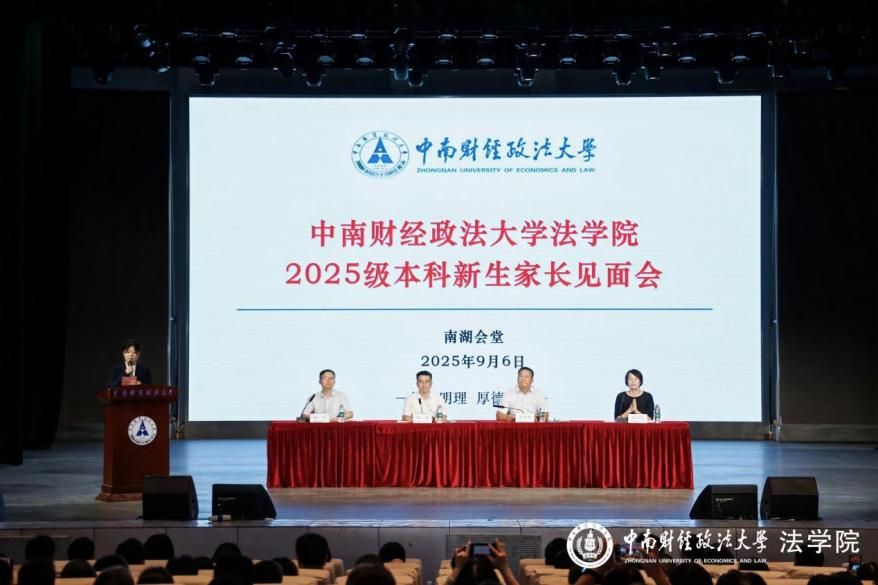 9月6日晚上七点,中南财经政法大学法学院2025级本科新生家长见面会在南湖会堂隆重举行。法学院党委书记高碧峰、学术院长侯猛、副院长杨柳、党委副书记李司铎出席会议,一同参会的还有法学院2025级本科生班导师及辅导员,以及近千余名2025级本科生家长代表。会议由党委书记高碧峰主持。