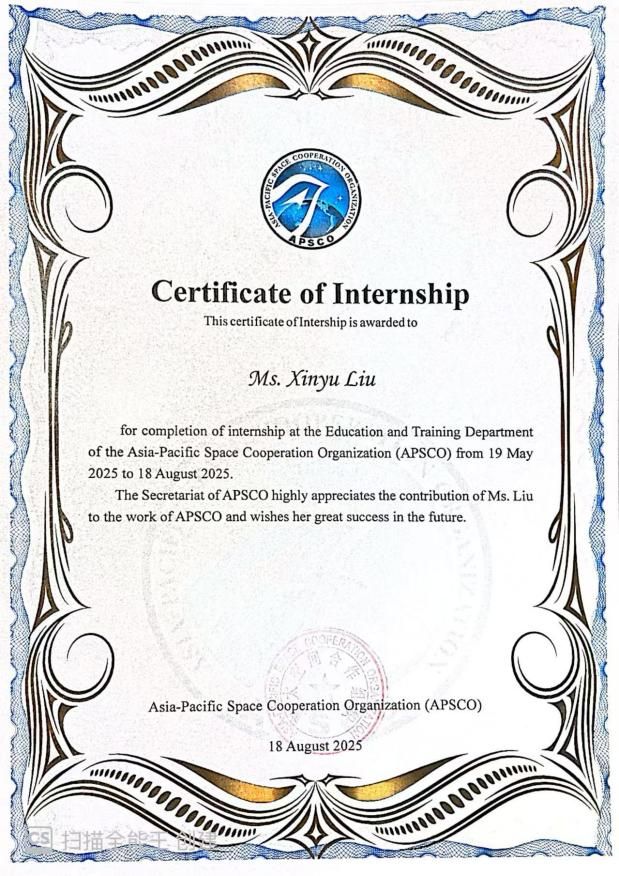 2025年5月至8月,经校出国(境)学习交流资助项目与法学院共同资助,我校法学院2021级本科生陈俊良、研究生刘昕宇赴亚太空间合作组织(APSCO)实习3个月,分别轮岗于战略规划与项目管理部(SPPM)、秘书长办公室(SG Office)及教育与培训部(E&T)。