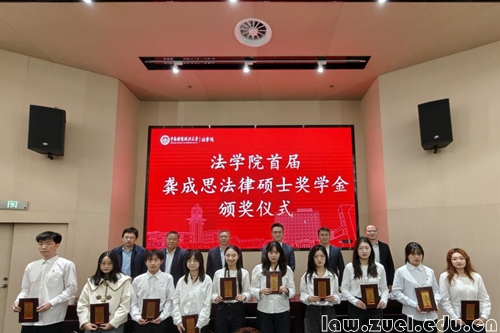 最后,侯猛院长宣读首届“龚成思法律硕士奖学金”获奖名单,其中法律(法学)专业舒睿、王佳琪、徐欣怡、孔德秀、张佳雯,法律(非法学)专业张彬、刘晓艺、陶璐萍、王加明、解钧毅共10位同学获此殊荣,参会嘉宾共同为获奖同学颁发荣誉证书并合影。