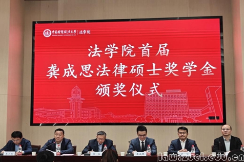 2025年11月13日上午,中南财经政法大学法学院首届“龚成思法律硕士奖学金”颁奖仪式在法学科研大楼一楼小报告厅举行。校党委常委、副校长覃红,法学院法律硕士行业导师、奖学金捐赠人、湖北浩泽律师事务所高级合伙人兼副主任龚成思,院长兼法律专业学位教育中心主任侯猛,副院长兼法律专业学位教育中心副主任秦小建,党委副书记、纪委书记兼行政副院长陈金川及学生代表参会。颁奖仪式由法学院党委书记高碧峰主持。