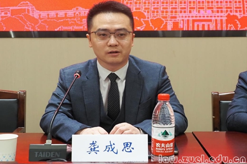 随后,龚成思律师以“感谢、分享、祝福”为关键词,讲述了设立奖学金的初衷。他感恩法学院的人文关怀和本次活动的精心安排,并分享了早年受到师长资助的求学经历,正是这份温暖让他始终怀抱感恩之心,激励他在中南大勤奋学习、最终获得多项奖学金并成功保研深造。他表示,设立奖学金不仅是反哺母校,更是希望搭建一座桥梁,让温暖延续。最后,他寄语获奖同学:“获得奖学金只是起点,而非终点”,鼓励大家在研究生阶段继续刻苦钻研,未来有能力时回归母校,让这份爱心持续传递。