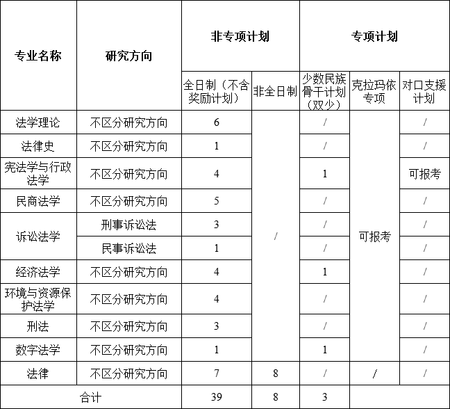 “对口支援专项计划”为定向培养招生计划,招生对象是受援高校在职教师中具有普通高等教育研究生学历和硕士学位的人员,申报受援高校为新疆财经大学、新疆政法学院、甘肃政法大学。2026年具体受援高校及招生计划数以教育部下达为准。