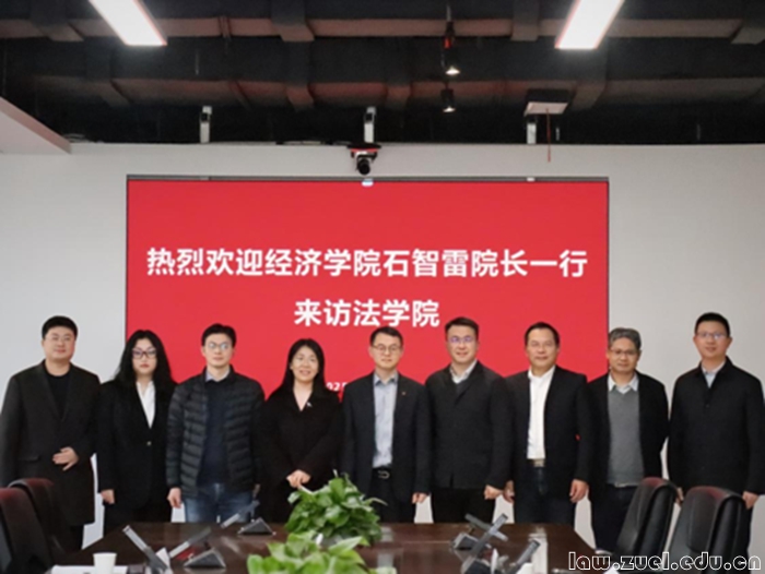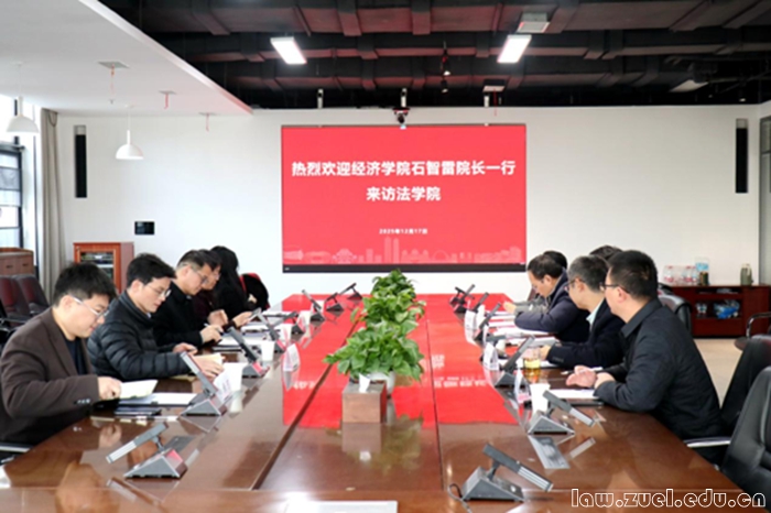 12月17日上午,经济学院院长石智雷,副院长宋丽智、张鸿武,副教授曾盈盈,党政办公室主任张可一行到访法学院,就学科交叉融合与协同发展进行专题调研。法学院院长侯猛,副院长袁中华,经济法学系教授尤明青,党政办公室负责人张申鹏,教务秘书李小姣共同参与座谈。会议在文湛楼309举行,由袁中华副院长主持。双方就学科建设、人才培养、科研协同及跨学科融合发展等议题展开深入探讨,重点展望了法学与经济学领域的合作前景与实施路径。
