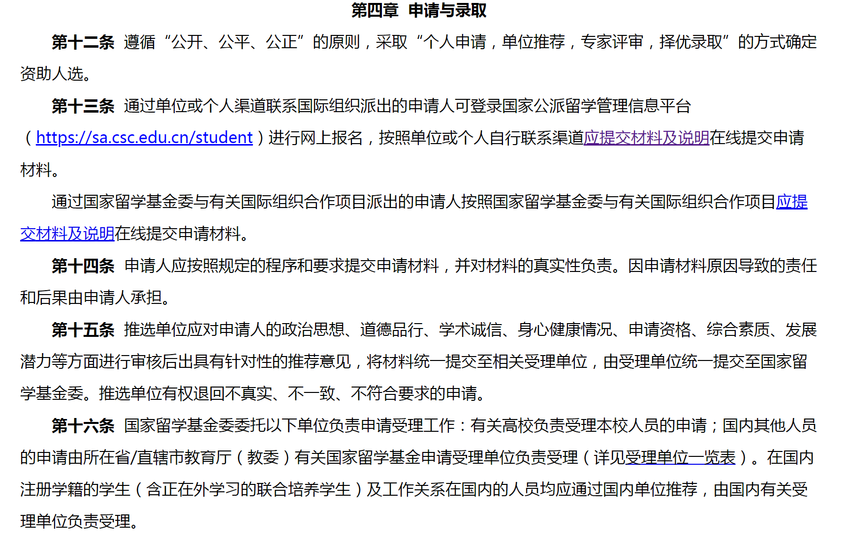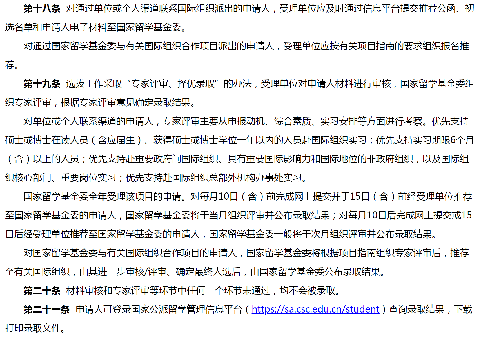 对国家留学基金委与有关国际组织合作项目的申请人,国家留学基金委将根据项目指南组织专家评审后,推荐至有关国际组织,由其进一步审核/评审、确定最终人选后,由国家留学基金委公布录取结果。