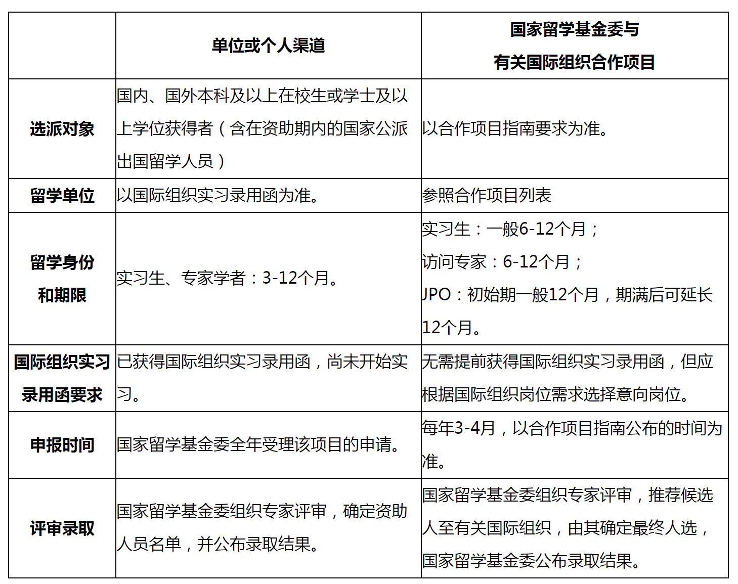 答:国际组织实习项目包括两个申报渠道:单位或个人渠道和国家留学基金委与有关国际组织合作项目,区别如下: