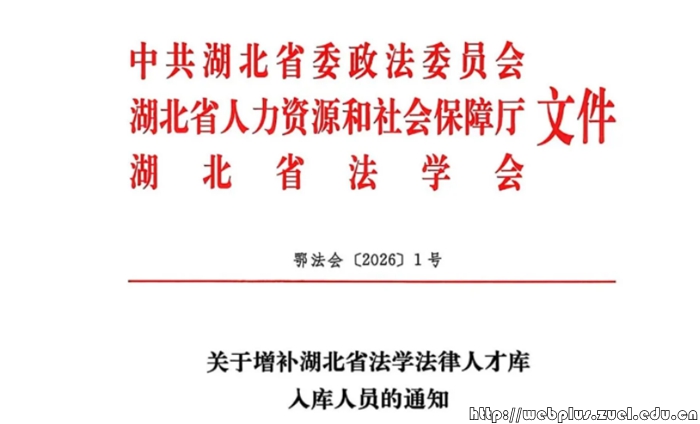 近日,中共湖北省委政法委、湖北省人力资源和社会保障厅、湖北省法学会联合印发《关于增补湖北省法学法律人才库入库人员的通知》,公布了湖北省法学法律人才库首次增补入库人员名单。法学院凭借深厚的法学学科积淀与卓越的人才培养实力,共有12位学者成功入选,涵盖“湖北省法学名家”“湖北省法学法律专家”“湖北省青年法学法律人才”三大类别,充分彰显了学校在法学研究、法治实践及人才培养领域的强劲综合实力与广泛影响力。