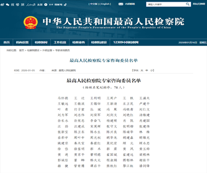 2026年1月5日,最高人民检察院公布新一届专家咨询委员名单,共78位专家学者入选。在此次聘任中,法学学科教师校友表现突出,法学院黎江虹教授、知识产权学院黄玉烨教授获聘为咨询委员。同时,我校王利明、王锡锌、刘为军、刘艳红、张明楷、顾元、黄进(按姓名笔画排序)七位校友亦名列其中。
