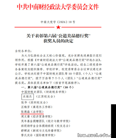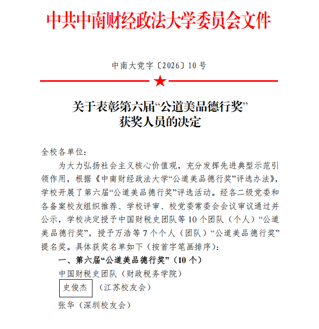 近日,学校正式发布《关于表彰第六届“公道美品德行奖”获奖人员的决定》(中南大党字〔2026〕10号),我院二级教授、博士生导师张德淼获评此项荣誉。