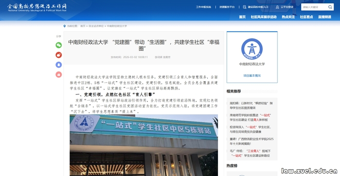 全国高校思想政治工作网以《中南财经政法大学 “党建圈”带动“生活圈”,共建学生社区“幸福圈”》为题,报道推介法学院通过党建引领,打造融教育、管理、服务于一体的育人高地,共建一站式学生社区“幸福圈”的典型案例。