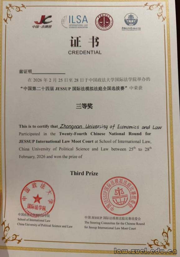2026年2月25日至2月28日,第二十四届杰赛普(The Philip C. Jessup International Law Moot Court Competition, Jessup)国际法模拟法庭比赛中国赛区选拔赛成功举办。今年,一共有来自全国各地的68支高校代表队参加竞赛,经过激烈角逐,我校代表队荣获全国选拔赛团体三等奖。