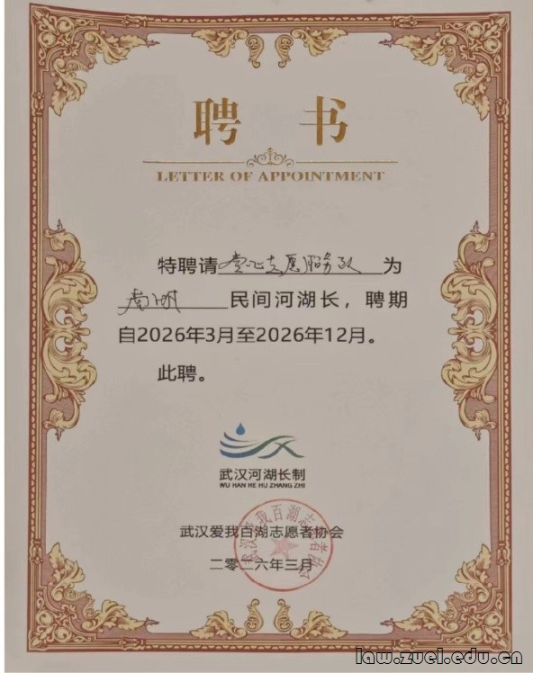 (通讯员:钟开炜 陈一凡 叶茂林)3月1日,受武汉市水务局委托,武汉爱我百湖志愿者协会发布《2026年市级民间河湖长选聘结果通报》,法学院志愿者协会“壹心”志愿服务队再次受聘担任“南湖(市级)民间湖长”。3月28日,“壹心”志愿服务队副队长陈一凡、队员叶茂林代表服务队前往江岸区知音国色美学生活馆参加“十年·拾阶”民间河湖长培训会议暨受聘仪式。
