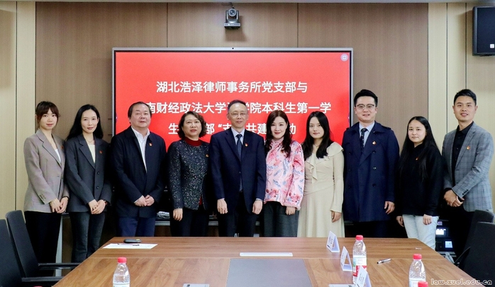 为深入学习贯彻习近平法治思想,深化律所与高校党建合作,推动法学理论与法律实务深度融合,助力高素质法治人才培养,4 月 1 日下午,湖北浩泽律师事务所党支部与法学院本科生第一学生党支部联建活动在南湖校区文治 915 会议室顺利举行。湖北浩泽律师事务所多位合伙人、骨干律师及法学院本科生第一学生党支部党员代表共同参与本次活动。