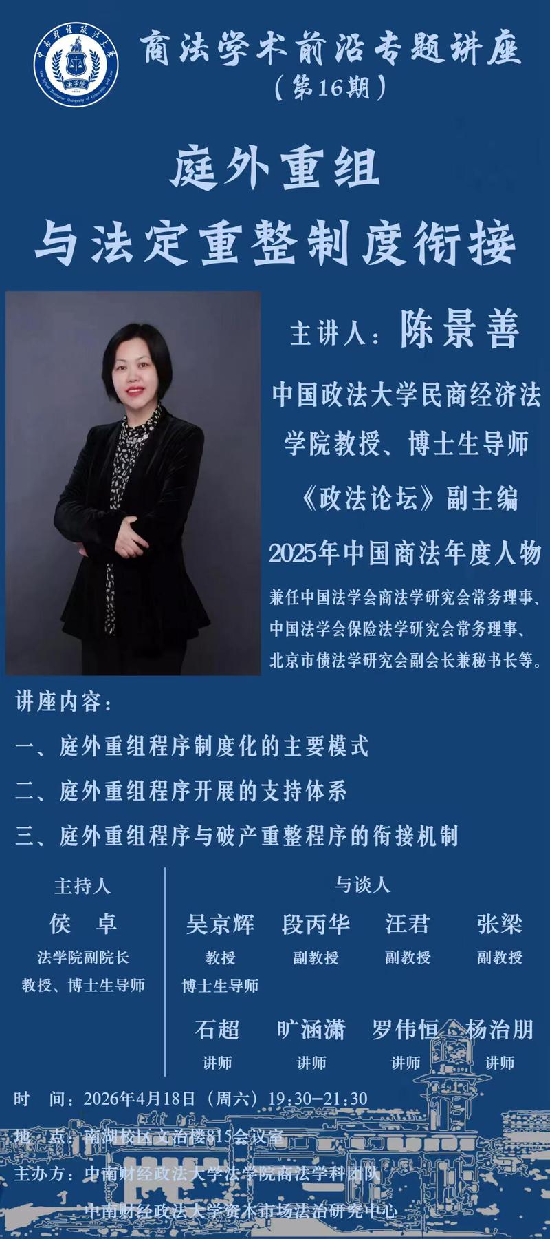 预告|商法学术前沿专题讲座(第16期) 陈景善:庭外重组与法定重整制度衔接