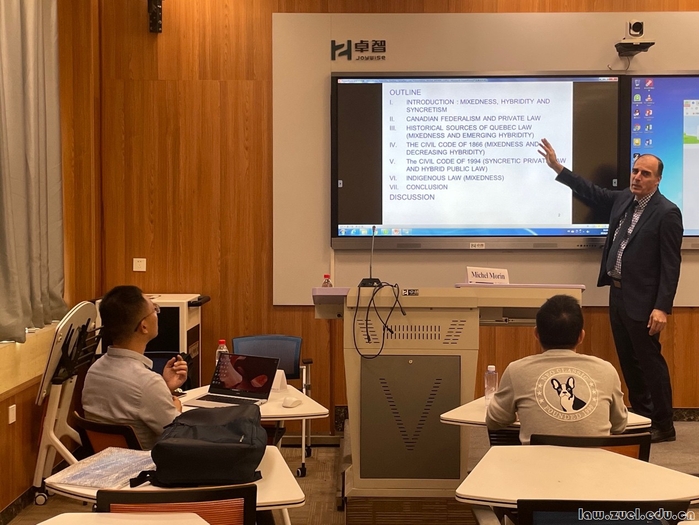2026年4月17日16:00-17:30,涉外法治创新课程第33期在文波楼智慧教室106顺利举办。本次讲座由蒙特利尔大学Michel Morin教授主讲,中南财经政法大学程乐副教授主持,昝强龙副教授和温长庆副教授担任与谈人,我校涉外法治创新班学生及各系学生参与讲座并展开交流。
