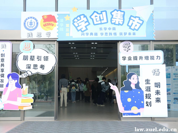 为进一步弘扬优良学风,深化“四全育人”实践,4月23日下午,法学院在文湛楼一楼举办第三届“学创集市”,一站式打造法科学子学习发展成长平台。活动以集市摊位的形式,围绕“学、思、践、悟”四大板块设置展览区与主题摊位,开展特色学习成长发展活动,为法科学子提供全流程、全方位、精准化的成长发展指导服务。